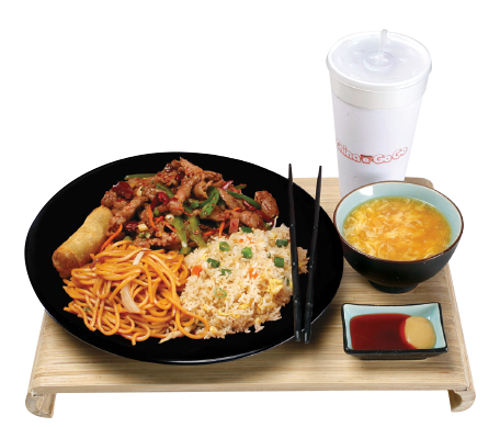 Includes one lunch size entree, fried rice and chow mein noodles.
